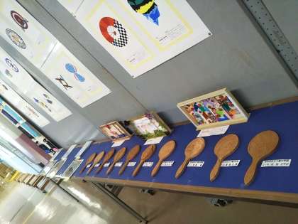学年だよりなどでもお伝えしていますが、世田谷区作品展覧会に出品された各教科の作品を渡り廊下に展示しています。どれも素敵な作品です。