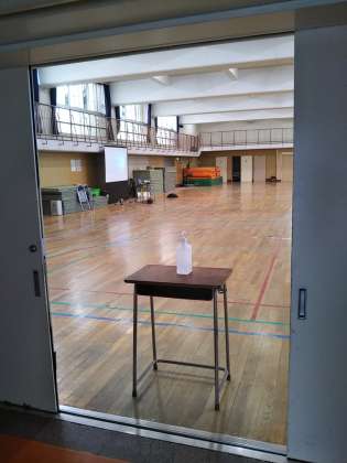 保健体育では、体育館の入り口にアルコールを設置し、授業の前後に必ず手指消毒を行っています。