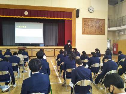 授業におけるコロナ対策を一部紹介します。社会では、公民の授業を合同で体育館で行いました。エアコンを稼働させ、蜜の状態を避けながら、活発な意見交換が行われていました。