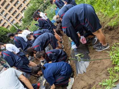 千歳中学校恒例行事で、芋の苗を植え、雑草を取り、収穫し、出品し、募金するという一連の流れです。今日はその第一弾として、芋の苗植えを行いました。地域の方のご指導、協力もあり、スムーズに行うことができました。