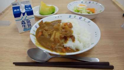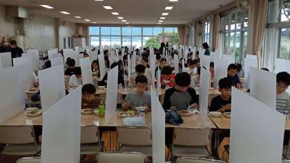 宿舎での夕食は、パーテーションで区切られた空間で黙食しています。
