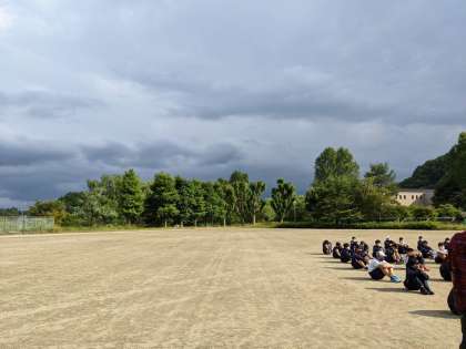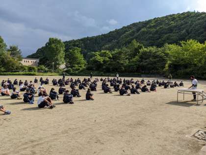 予定通りに宿舎に到着し、開園式を行っています。このあと入室、レク、お風呂、食事になります。
