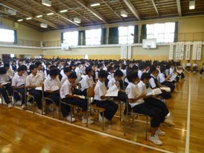 本日5・6時間目に、生徒会役員選挙の立会演説会と投票が行われました。どの候補者・応援演説者も、全校生徒を前にして堂々とした素晴らしい演説でした。また、聞いている生徒も、暑い中でしたが、真剣な表情で演説者の言葉に耳を傾けていました。
