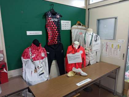 来週、東京オリンピックに出場した陸上の山下選手をお招きして、講演会を行います。講演会に先立ち、本日より東京オリンピックで実際に使用したスーツ、ジャージ、ユニフォーム、スパイクを展示しています。