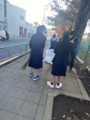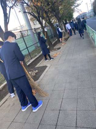 ボランティアの生徒を募り、学校付近の落ち葉掃きを行いました。