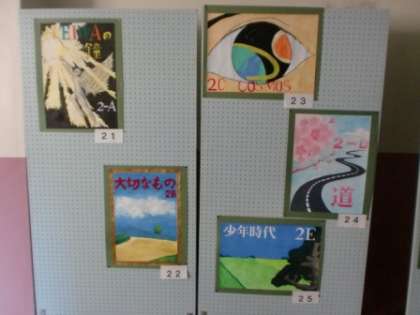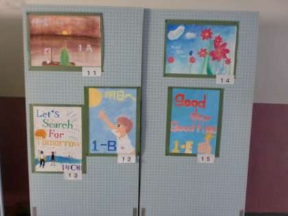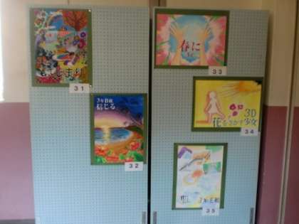 自由曲イメージポスターの掲示が2階の渡り廊下で行われています。このポスターは自由曲の詞を読んでイメージをふくらませて描いたもので、どのクラスもとてもきれいに仕上がっています。