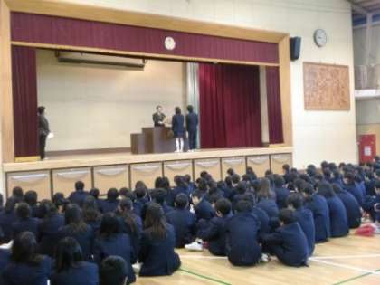 整列から司会・進行まで生徒が行う生徒朝会が行われました。生徒会役員から、今期生徒会のスローガンである「飛躍」や、布章・バッジ点検に関して説明がありました。