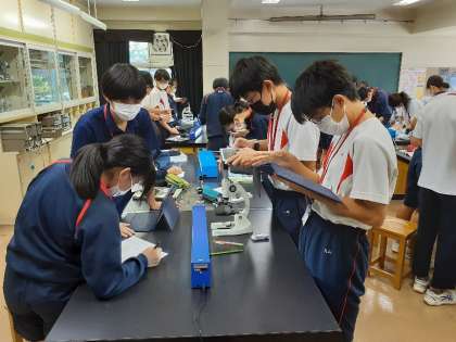 理科の時間で「中和」について学んでいます。塩酸と水酸化ナトリウムの中和実験でできた結晶を観察しています。