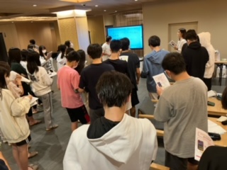 明日に向けての打ち合わせ中です。どの班も安全に行動できるよう、しっかり話を聞いています。