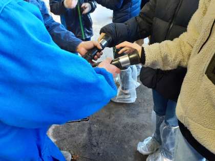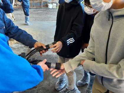 ミルカーに親指をいれて乳搾りされる牛の気持ちになってみました。吸う力は牛の赤ちゃんと同じくらいだそうです。