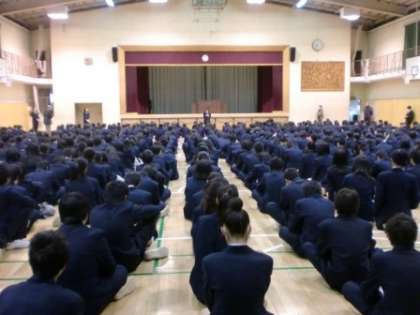 整列から司会進行まで生徒が行う生徒朝会がありました。投書箱に入れられた意見に対して、生徒会役員が答える場面では、全校生徒を前にとても堂々と話をしていました。