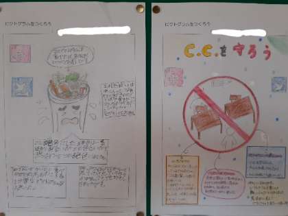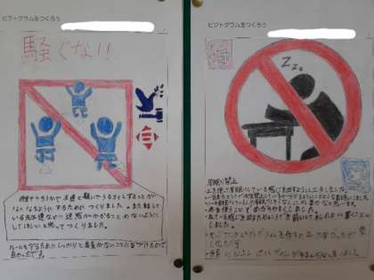 千歳ゼミのまとめの発表を行っています。ピクトグラムを作るゼミです。伝えたいことを自分なりに表現しています。