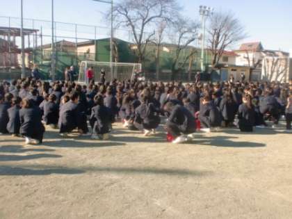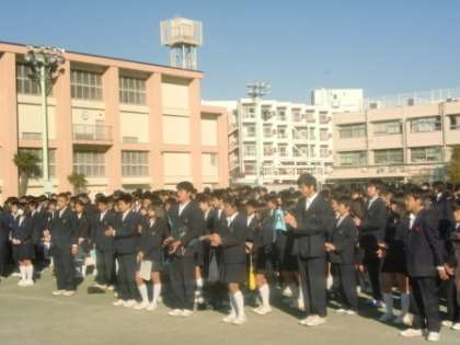その後、校庭で生徒朝会を行い、各委員会や部長会から連絡・報告を行いました。また、エプロン点検の表彰も行われました。話をしていた生徒会役員や委員長は2年生ですが、とても堂々としていて立派でした。