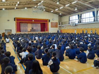 朝会が行われ、、挨拶や運動会に向けての話がありました。