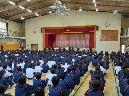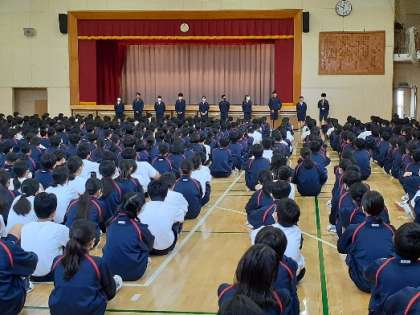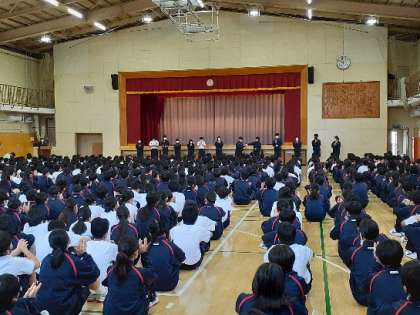 最初の全体練習。雨のため体育館で全校集会のかたちで行われました。各学年の実行委員が紹介されました。