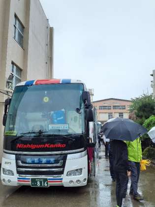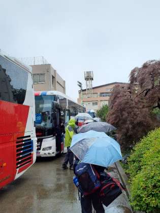 あいにくの天気となってしまいましたが、バスの中は生徒たちの元気な声で溢れています。