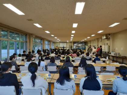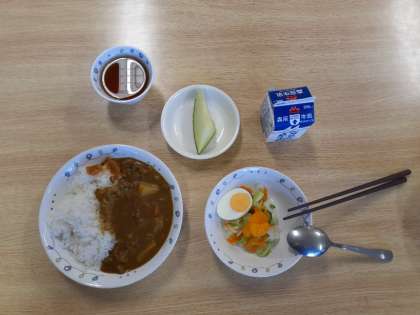 夕食のメニューはカレーです。食事係の号令で「いただきます」