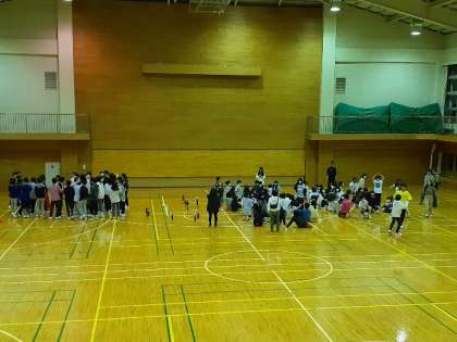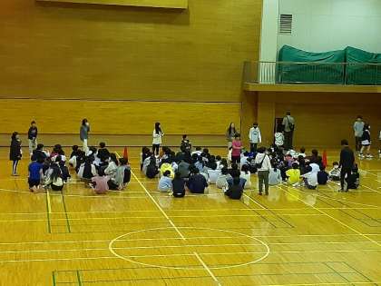 雨はあがりましたが、足元がぬかるんでいるのでキャンプファイアはなくなり、体育館でのレクリエーションになりました。内容は、全員リレー。クラスごとに走順の確認中です。