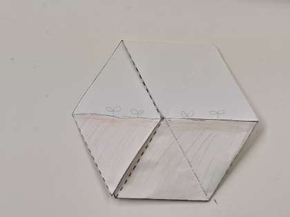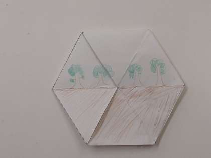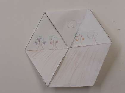 3年生は幼児のおもちゃで六角返しというおもちゃを作っています。3面でストーリーを作るものです。