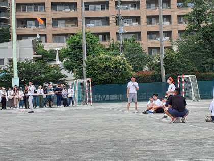 フリスビー。ペアが投げたフリスビーを取ります。とれたり。