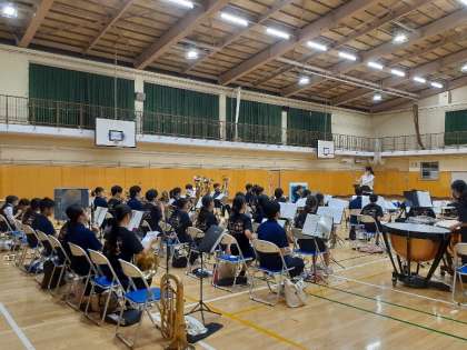本番に向けて体育館で練習中。暑いので適宜水分を取ることはもちろんですが、大型の扇風機や冷風機をつけて練習しています。