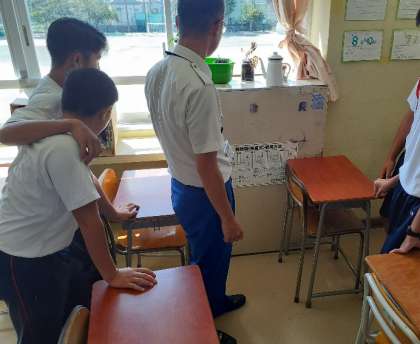 成城消防署に体験に行っている生徒たちが、千歳中に来て、消防署の方と防火設備の確認をしました。