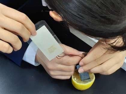 まず初めはレモン電池を作りました。オルゴールから音楽聴こえるかな?