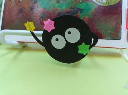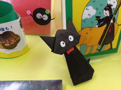 本の紹介コーナーに飾られている黒猫のジジ、まっくろくろすけ、トトロの折り紙は別室に通う生徒たちが作ってくれました。
