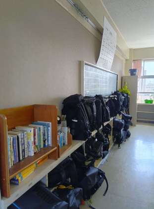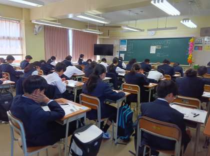 鞄はすべて後ろにおき、出席番号順に座って静かに受けます。