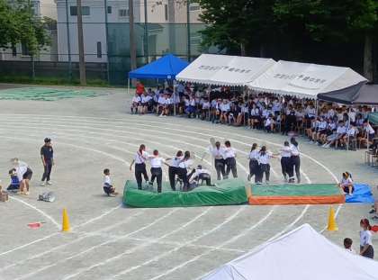 ゲットオーバー。4つの障害物を二人三脚で乗り越えたすきをつなぎます。