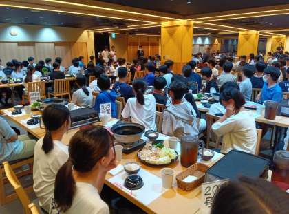 メニューはすき焼きです。お肉とご飯と卵が食べ放題です。たくさん食べて明日も頑張ろう。
