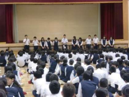 整列から司会進行まで生徒が行う生徒朝会があり、学級委員から9月の生活目標について説明がありました。