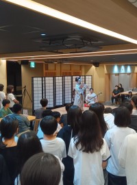 薬師寺のお坊さんのお話を聞きます。広い座敷で涼しい中でためになるお話です