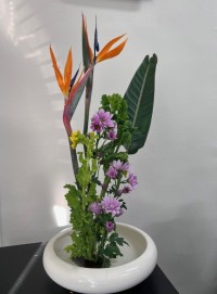 華道部の新しい作品です。鳥のくちばしのような、存在感のあるストレチアとその葉っ...