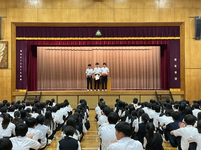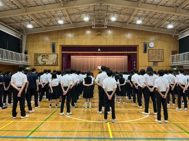 今日の朝礼では、校長の親の戦争体験をお話ししました。戦後80年。戦争体験者が少なくなっている中、戦争のむごたらしさや平和のありがたさを語り継ぎ、若者と一緒に平和な世界を創っていくことは大きな課題です。平和な世の中の基本、相手を大切にする心を学校生活ではぐくんでほしいという期待をお話ししました。
