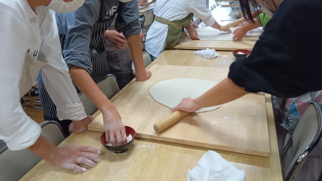 宿舎に戻り行動班で力を合わせて初めてのうどん作りを行いました。