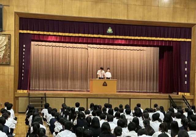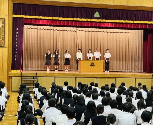 そして、今日から合唱コンクールに向けたクラス練習がはじまるということで、合唱コン実行委員長から「思い出に残すために一生懸命歌いましょう」と力強いアピールがありました。