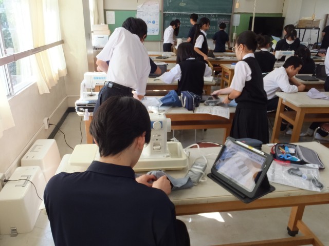 家庭科の授業では、2年生が巾着づくりに挑戦中です。