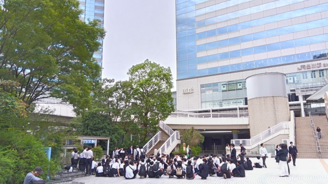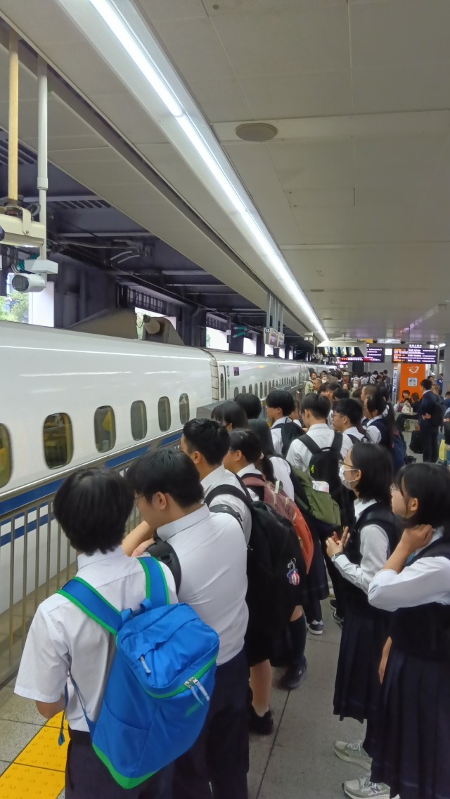 天気にも恵まれ、修学旅行1日目がスタート。遅刻者ゼロは幸先いいですね。PTA会長さん、副校長先生、岡本先生がお見送りに来てくださいました。