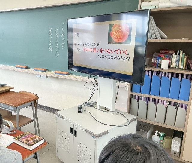 「アンネのバラ」を教材に平和への理解を深めました。授業前、アンネ・フランクについて知っている生徒は少なかったのですが、授業を通してアンネのバラの思いを引き継いで活動している中学校について知り、その学校で現在も行われている活動を学びました。