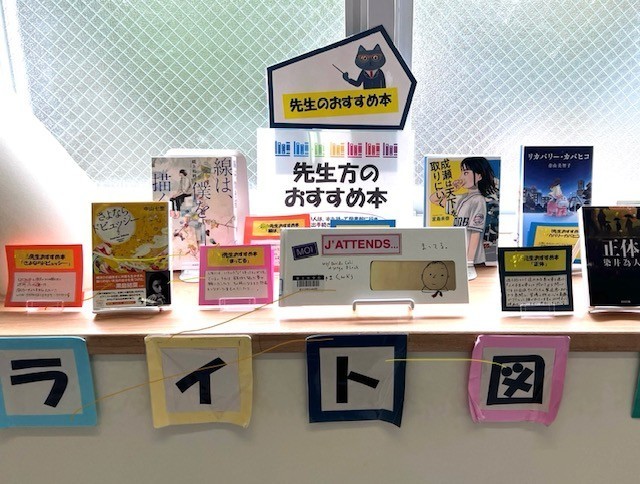 「サテライト図書館」は職員室のまえに学校図書館の本を出張展示しているコーナーのこと。リブネットの司書さんがその時期にふさわしい題材などを考えて展示してくださっています。