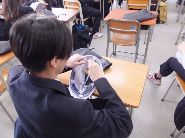本日の朝学活の時間、全校生徒を対象に避難用ヘルメットの使用法について説明を行いました。