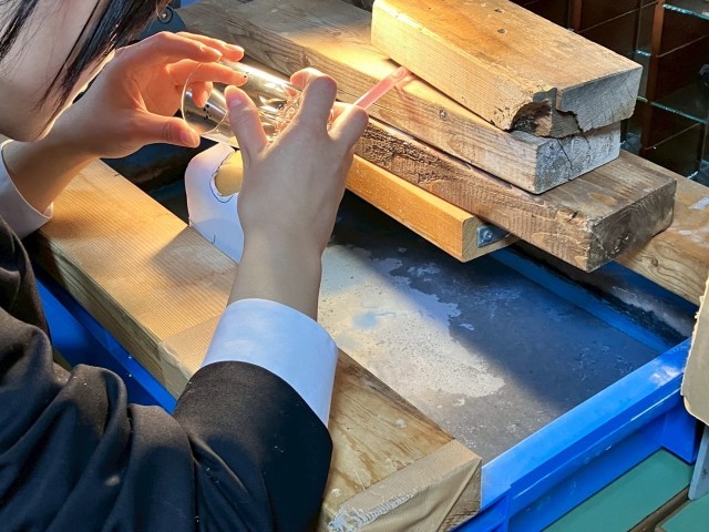 まるで職人のように作業しているこの班は、「江戸切子」の体験をしています。