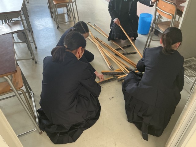 有志が集まり各教室のほうきのほこりとりや各階の廊下を清掃し、当日は予定の参加希望よりも多くの生徒が集まって美化意識を高めることができました。清掃が終わった後に「気分がいいな~」と感想を述べている生徒もいました。