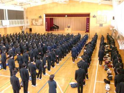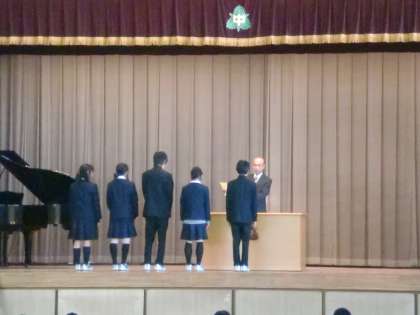 12月25日(火)2学期の終業式が行われました。校長先生のお話や校歌斉唱、冬休みの生活についての注意などとともに、各種検定の合格者やコンクールの入選者への表彰も行われました。生徒たちは、大きな荷物を抱え、通知表や年賀状、お年玉の話をしながら嬉しそうに下校していきました。1月7日まで冬休みです。