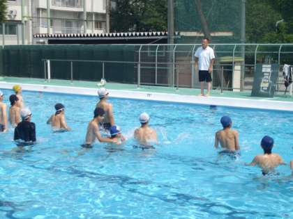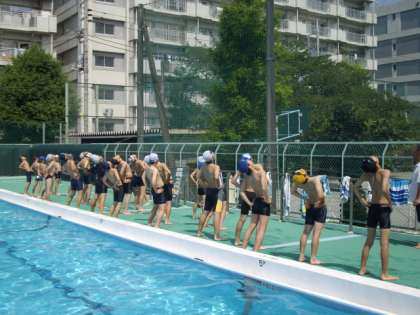 梅雨の晴れ間の中、20日(火)より水泳指導が始まりました。今年度、最初にプールに入ったのは1年生男子でした。小学校より深いプールに驚いていました。