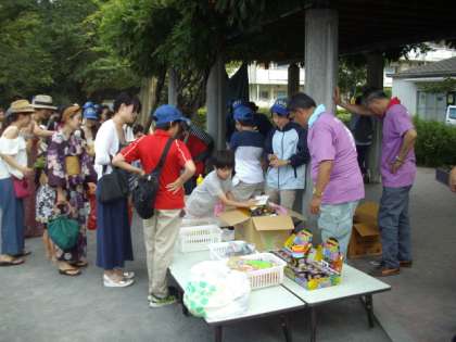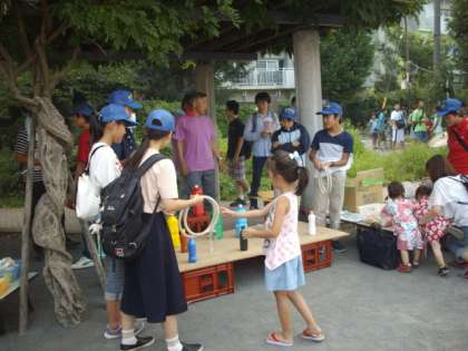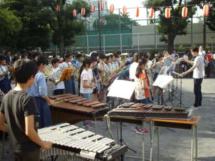 夏休み前の下代田東町会子どもまつり、今年も本校吹奏楽部の演奏で幕を開けました。ボランティアキャップを被った生徒たちは、各場所に分かれ、お店の運営や手伝いをしました。