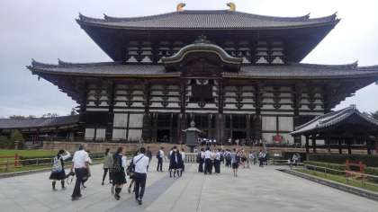 初日は奈良に入り、クラスごとに飛鳥を巡りました。夕方は東大寺で大仏の大きさに驚きの声をあげたり、奈良公園で鹿を間近で眺めたりしました。雨が降ることなく、初日の行程を終えました。