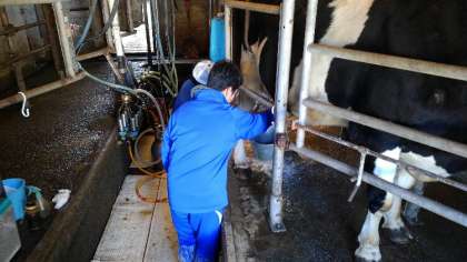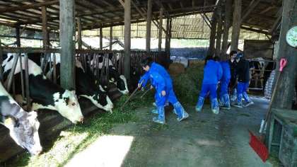 最終日も河口湖は快晴です。閉園式で学園に別れを告げ、午前中はクラスごとに3つの牧場に分かれ、酪農体験をしました。最後の食事となるとお弁当はミルクランドで富士山を眺めながら食べました。予定どおりの時刻に東京へ向かいます。