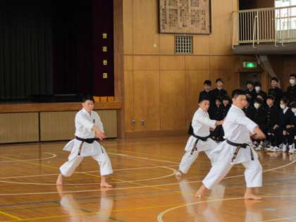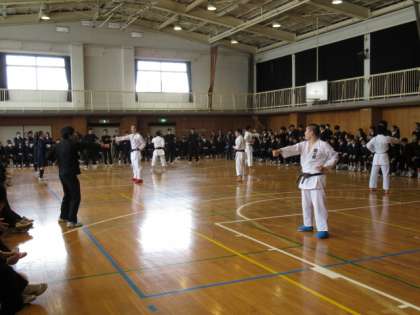 11月10日(金)の4校時は、国士舘大学の空手道部員を招いて、空手の演武と体験を行いました。迫力ある空手の型と組み手を間近で見ることができました。後半は生徒の空手体験と生徒からの質問に選手が答える時間としました。時間が足りないくらいに多くの質問が飛び出しました。